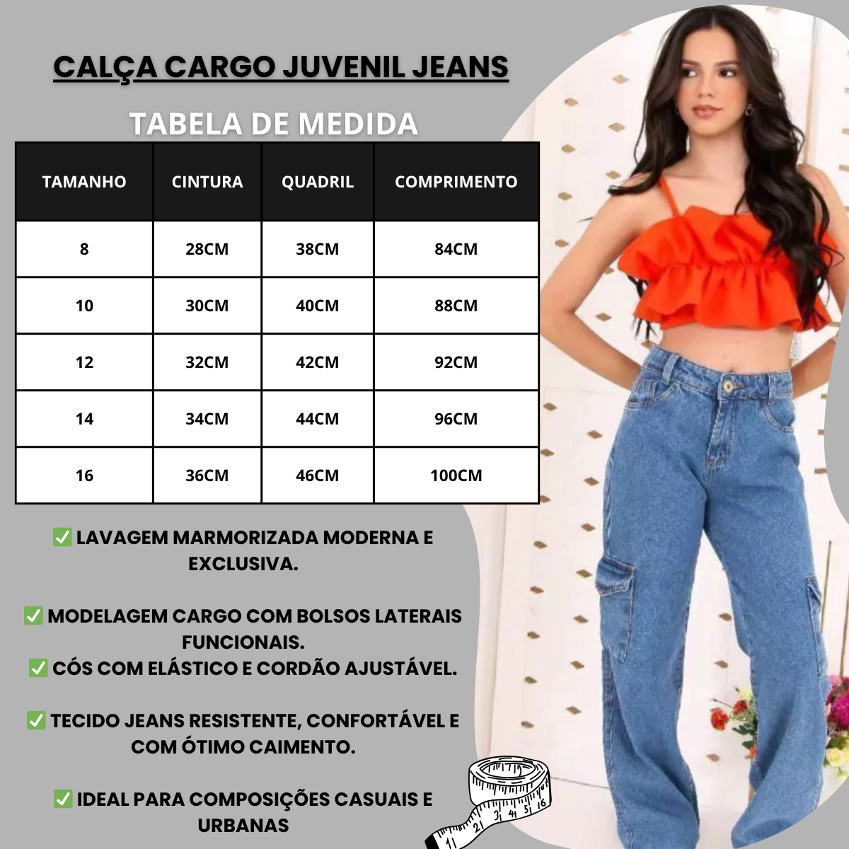 A calça cargo juvenil jeans marmorizada é a escolha perfeita para meninas que querem um visual moderno, autêntico e cheio de personalidade. Com lavagem marmorizada exclusiva, bolsos utilitários laterais e modelagem confortável, ela traduz a tendência street de forma leve e estilosa.